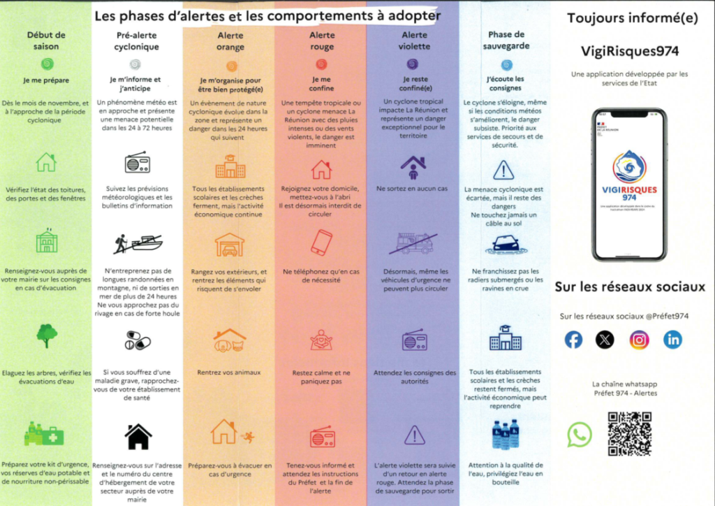 Chaque année, de novembre à avril, La Réunion est exposée aux cyclones. Pour assurer la sécurité de tous, la Préfecture active différents niveaux d’alerte selon l’évolution du phénomène. La SODEGIS souhaite rappeler à ses locataires les phases d’alerte et les comportements à adopter pour se préparer efficacement et protéger leur logement et leur famille.